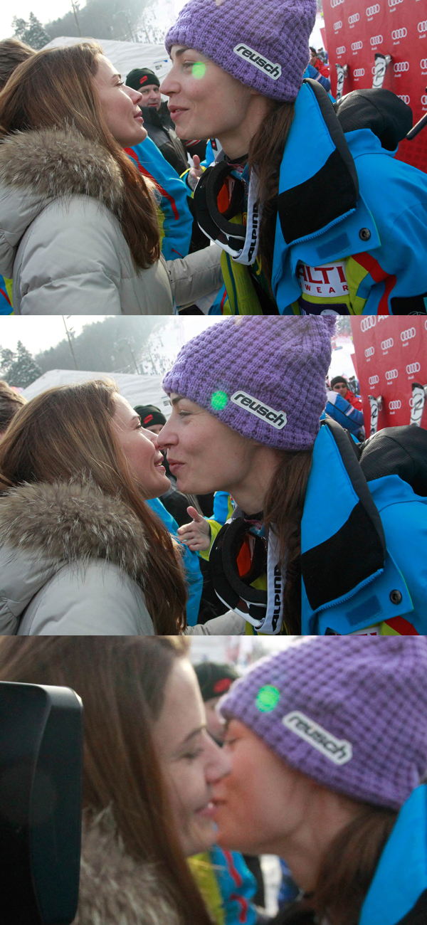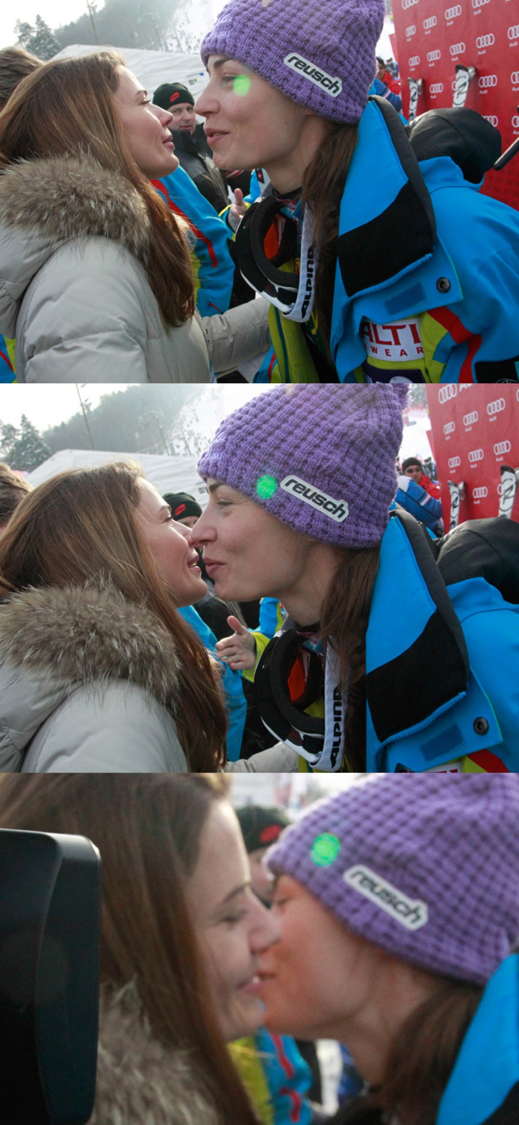 So pa fotografi in televizijske kamere sredi smučarske arene pod Pohojem dočakali poljub leta - med Tino Maze in Urško Bačovnik, soprogo predsednika vlade Janeza Janše. Medtem ko je bil Janša v Čilu, na vrhu Evropske unije in Latinskoameriških držav, je Bačovnikova tekmovanje za Zlato lisico spremljala oba dneva, soboto in nedeljo.