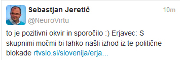 Po včerajšnjem sestanku z Alenko Bratušek ter izjavah Karla Erjavca o projektni vladi in poznih predčasnih volitvah je šefa stranke Desus na twitterju pohvalil Sebastjan Jeretič.