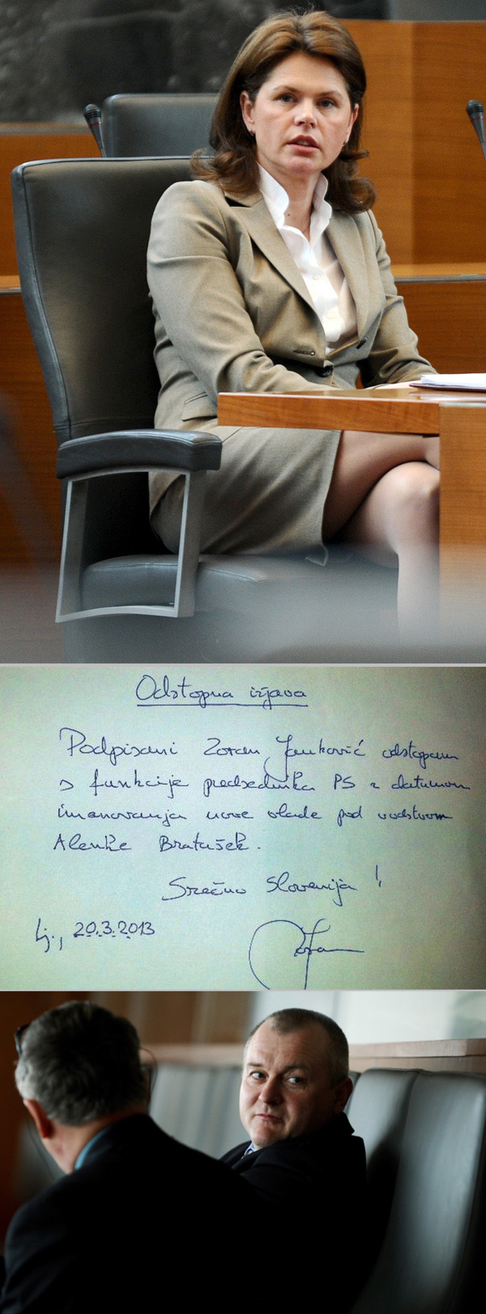 Od zgoraj navzdol: predsednica vlade Alenka Bratušek v svojem elementu; podpisana odstopna izjava Zorana Jankovića (za povečavo klikni na sliko); na balkonu velike dvorane državnega zbora je razpravo spremljal tudi nekdanji mariborski župan in državni svetnik Franc Kangler.