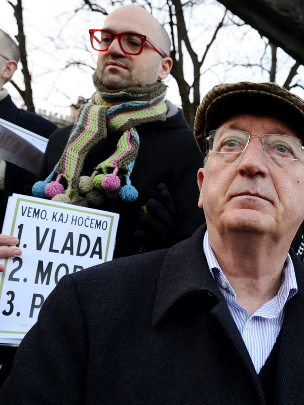 Vuk Čosić (levo zgoraj, desno spodaj Jože Pirjevec, na protestnem shodu 11. januarja letos) je pred dvema tednoma predaval poslanski skupini Pozitivne Slovenije v Ankaranu.