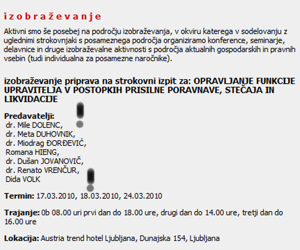 Vrhovni sodnik Mile Dolenc in okrožna sodnica Dida Vovk kot predavatelja na izobraževalnem seminarju stečajnih upraviteljev, marca 2010 v ljubljanskem hotelu Austria Trend. Organizator: Nebra d.o.o. …