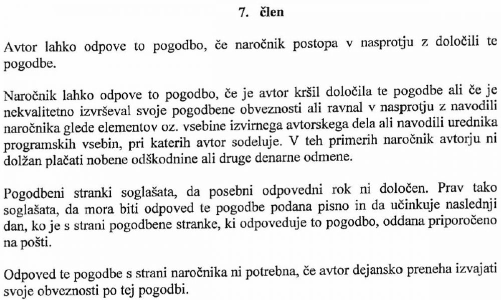 .. to pa je sedmi člen obstoječe pogodbe, ki zelo natančno opredeljuje, kdaj lahko avtor, torej Klemen Slakonja, pogodbo odpove. Le v primeru, če bi TV3 (kot naročnik) kršila določila pogodbe, vendar na TV3 zagotavljajo, da se to ni dogajalo.