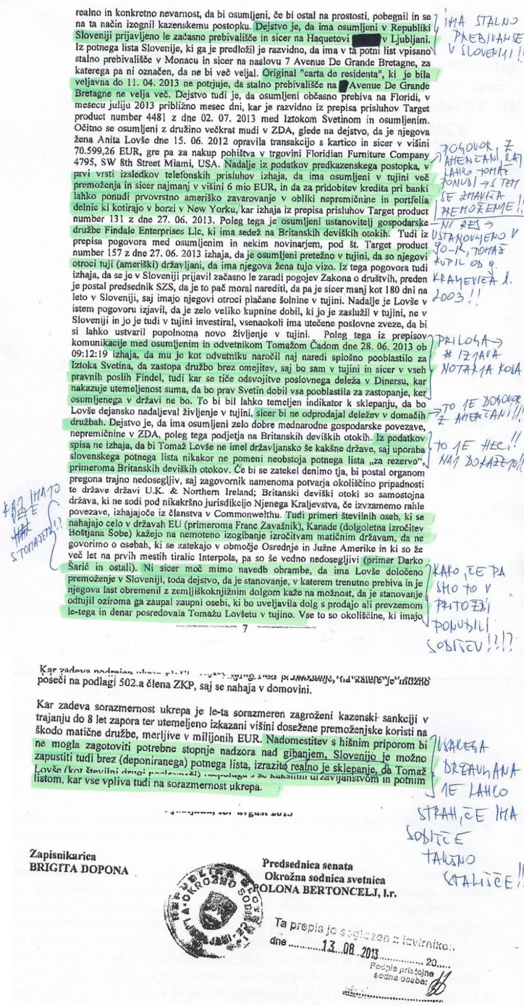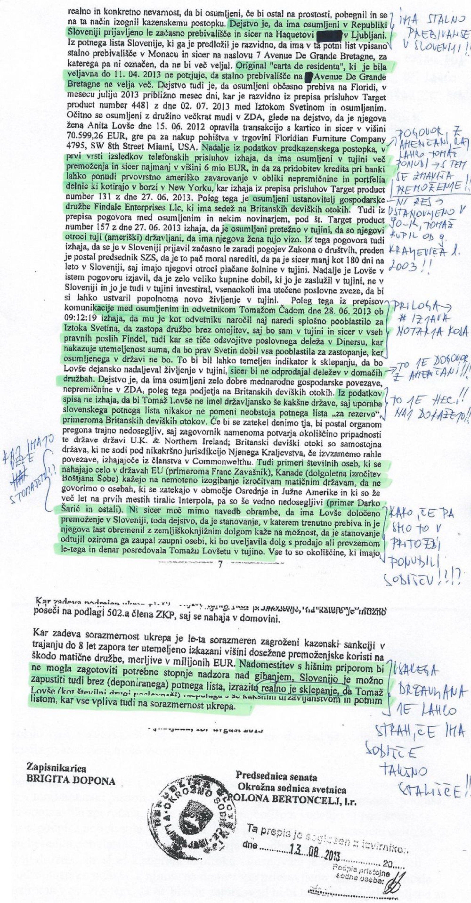 Del osem strani dolgega sklepa zoper Lovšetovo pritožbo o podaljšanju pripora, je podpisala okrožna sodnica Polona Bertoncelj, ob strani dokumenta pa so zapiski Anite Lovše (za povečavo klikni na sliko).