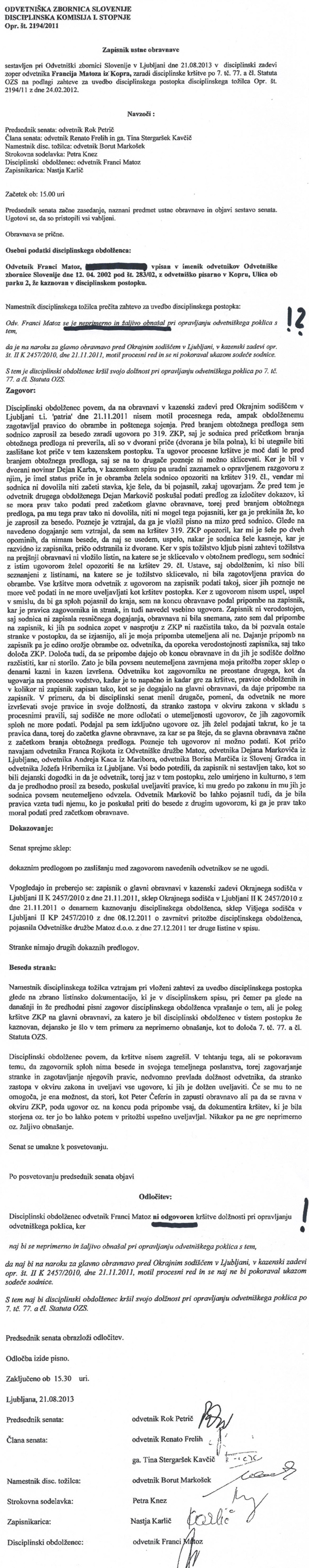 Zapisnik ustne obravnave pred disciplinsko komisijo odvetniške zbornice, ki je oprostila Francija Matoza (za povečavo klikni na sliko).