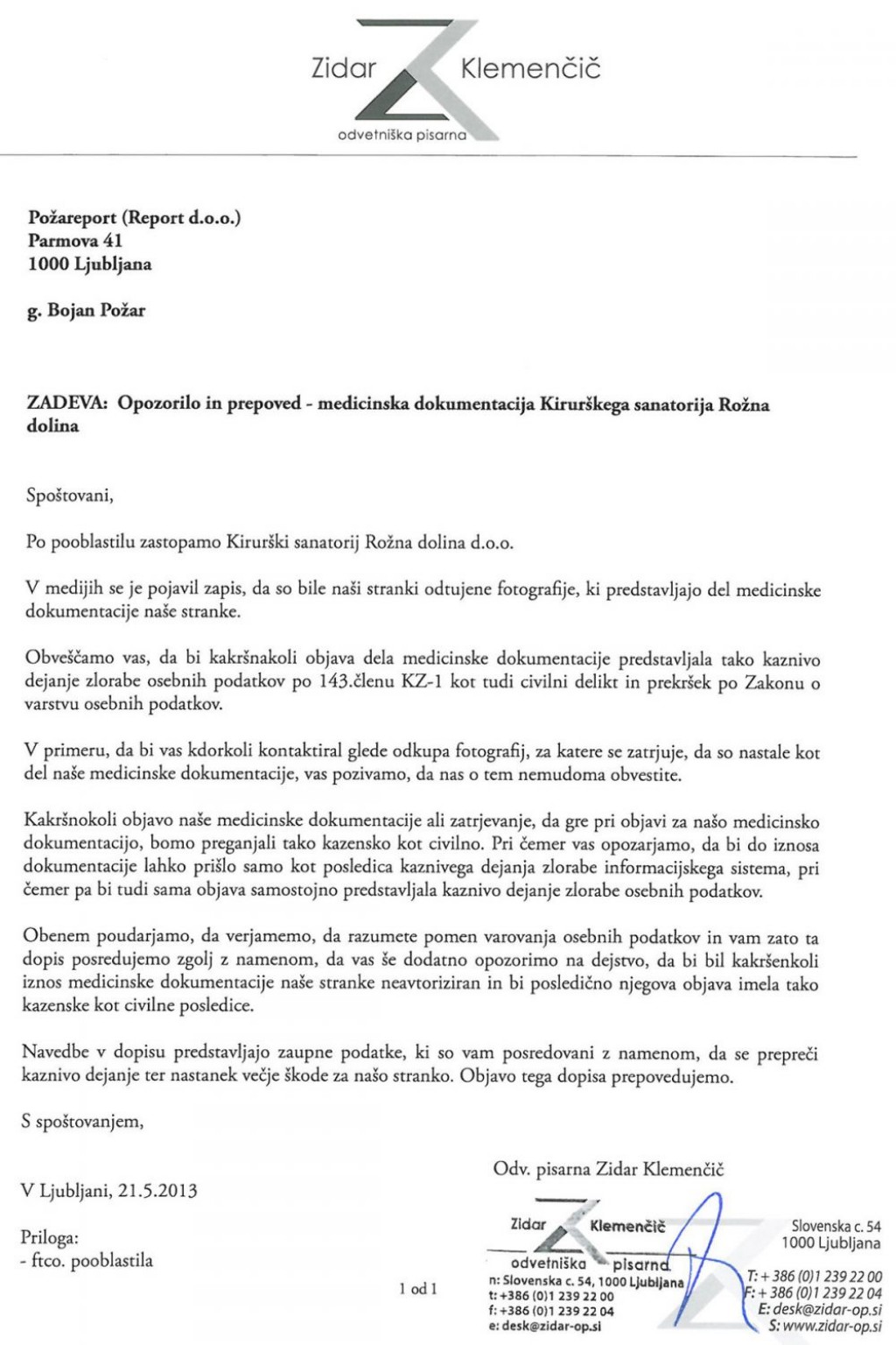 Dopis odvetnice Nine Zidar Klemenčič, ki so ga včeraj dobili nekateri mediji. Malo pred tem dopisom smo prejeli tudi šest fotografij Tanje Ribič med operacijo v Kirurškem sanatoriju.